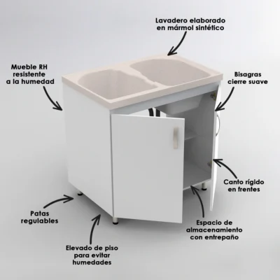 Lavadero de 90×60 cm, diseño compacto, cuenta con fregadero y sistema dispensador de agua (flauta ahorradora), en complemento con mueble resistente a la humedad (RH), con amplio espacio de almacenamiento, ideal para optimizar espacios en tu zona de labores.