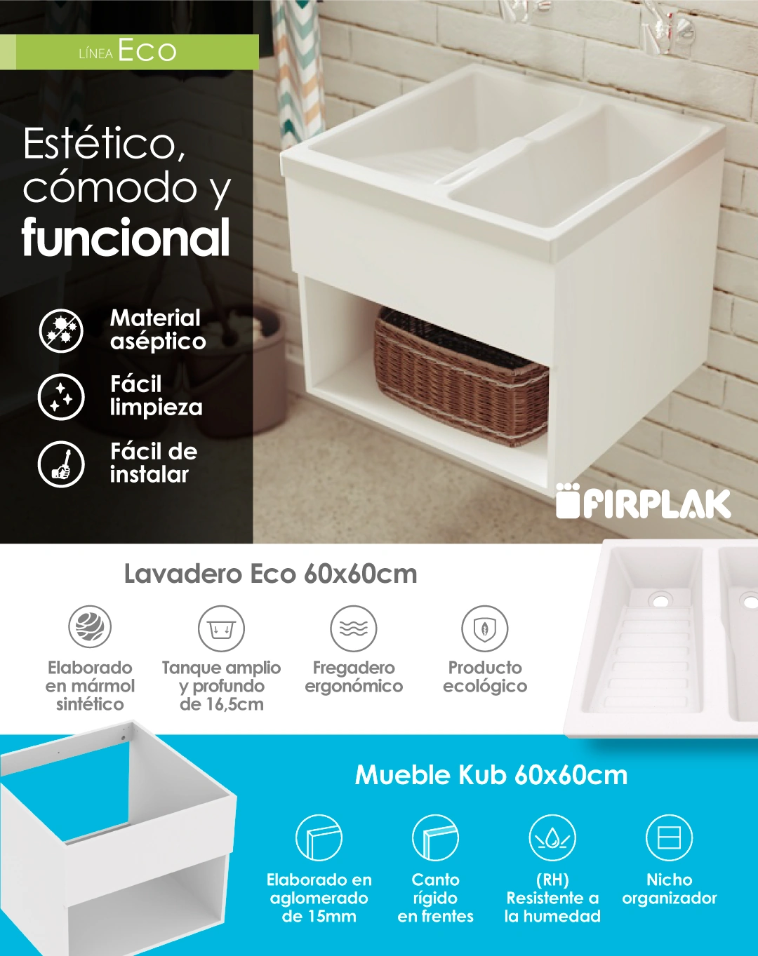 COMBO LAVADERO ECO + MUEBLE RH KUB 60X60CM