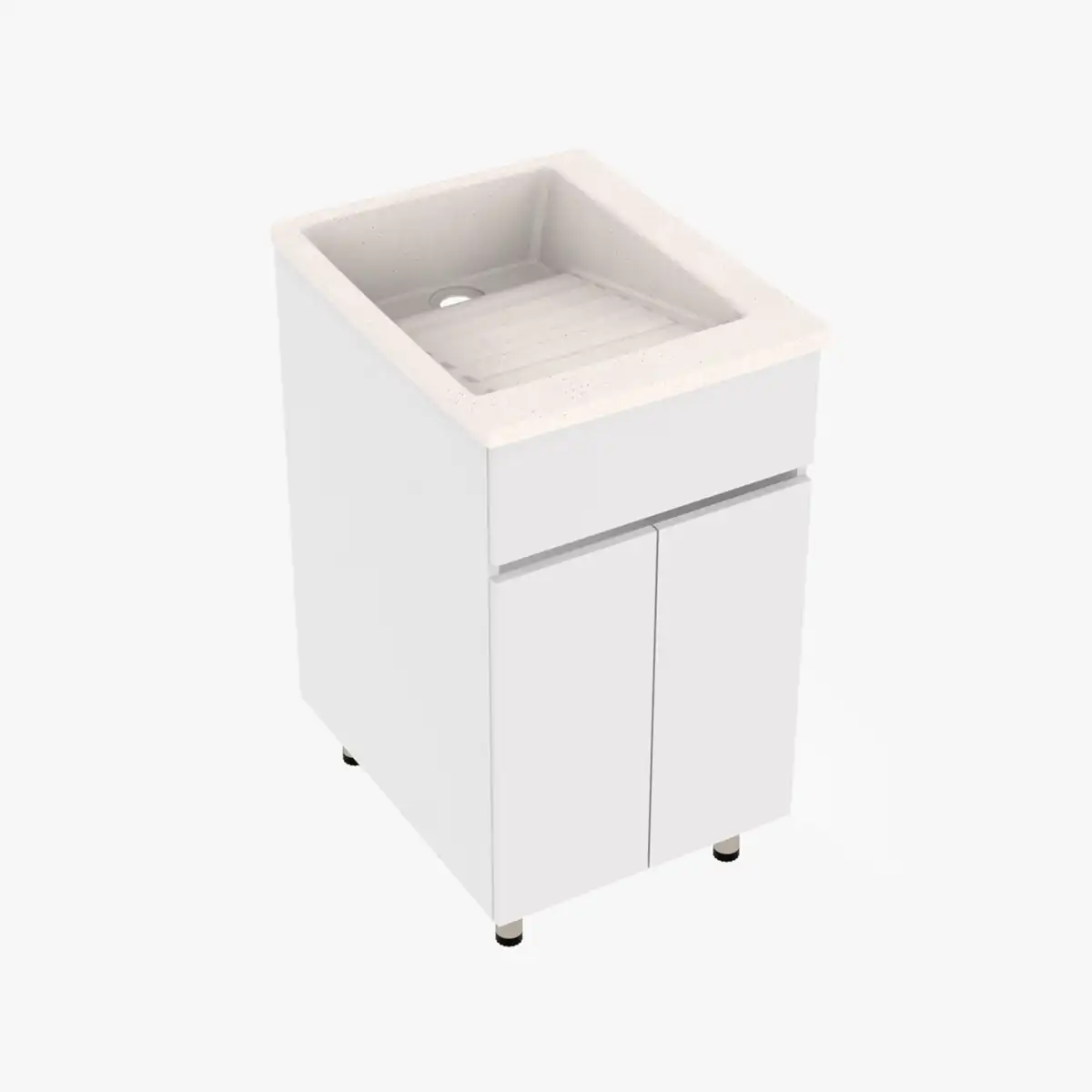 El lavadero Eco de 48x60cm elaborado en mármol sintético, es ecológico, aséptico y cuenta con un diseño compacto y ergonómico; que en combinación con el mueble RH resistente a la humedad, con patas regulables, canto rígido en frentes, entrepaño móvil, puertas con bisagras cierre suave y diseño de puertas sin manijas, será ideal para darle a tu zona de labores un ambiente agradable y estético. Ideal para espacios pequeños.