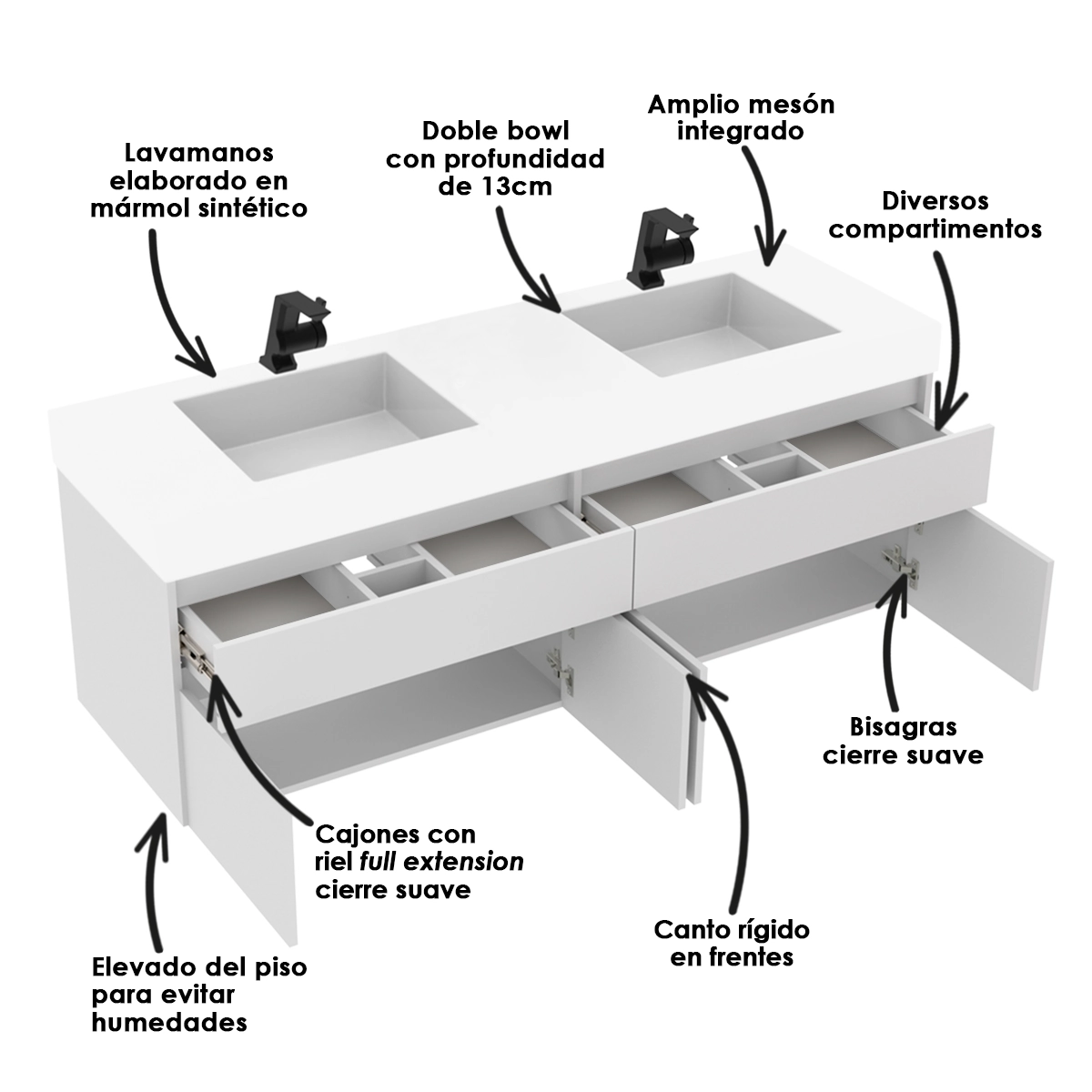 Combinación moderna entre el lavamanos Oslo con diseño minimalista y amplio mesón integrado. Mueble Macao de la línea Class con amplio espacio de almacenamiento, elegante y fácil de armar, conjunto que evoca estilo y practicidad para su baño.