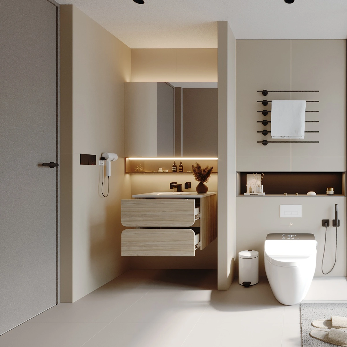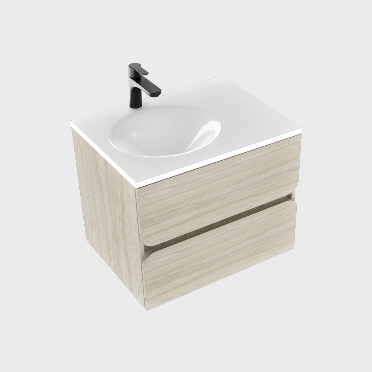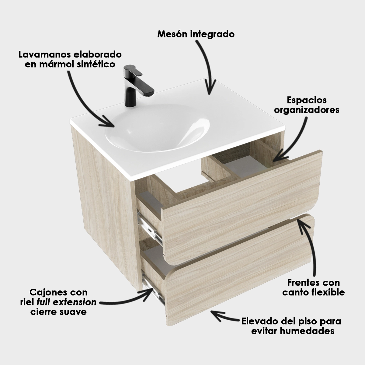 Lavamanos Parma de 63x48cm tipo vanity, elaborado en mármol sintético y con mesón integrado, en complemento con el nuevo mueble para baño ZACURA elevado, compuesto por dos cajones sin manijas y de amplio espacio de almacenamiento, mantendrán la estética y el orden que su baño merece.