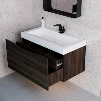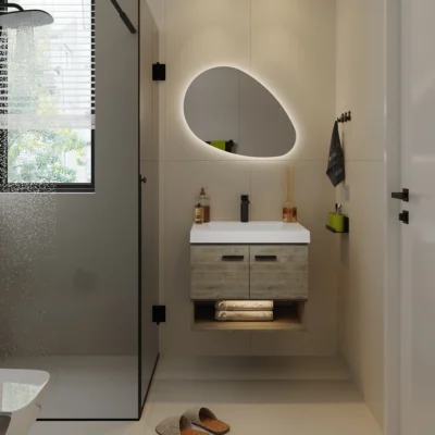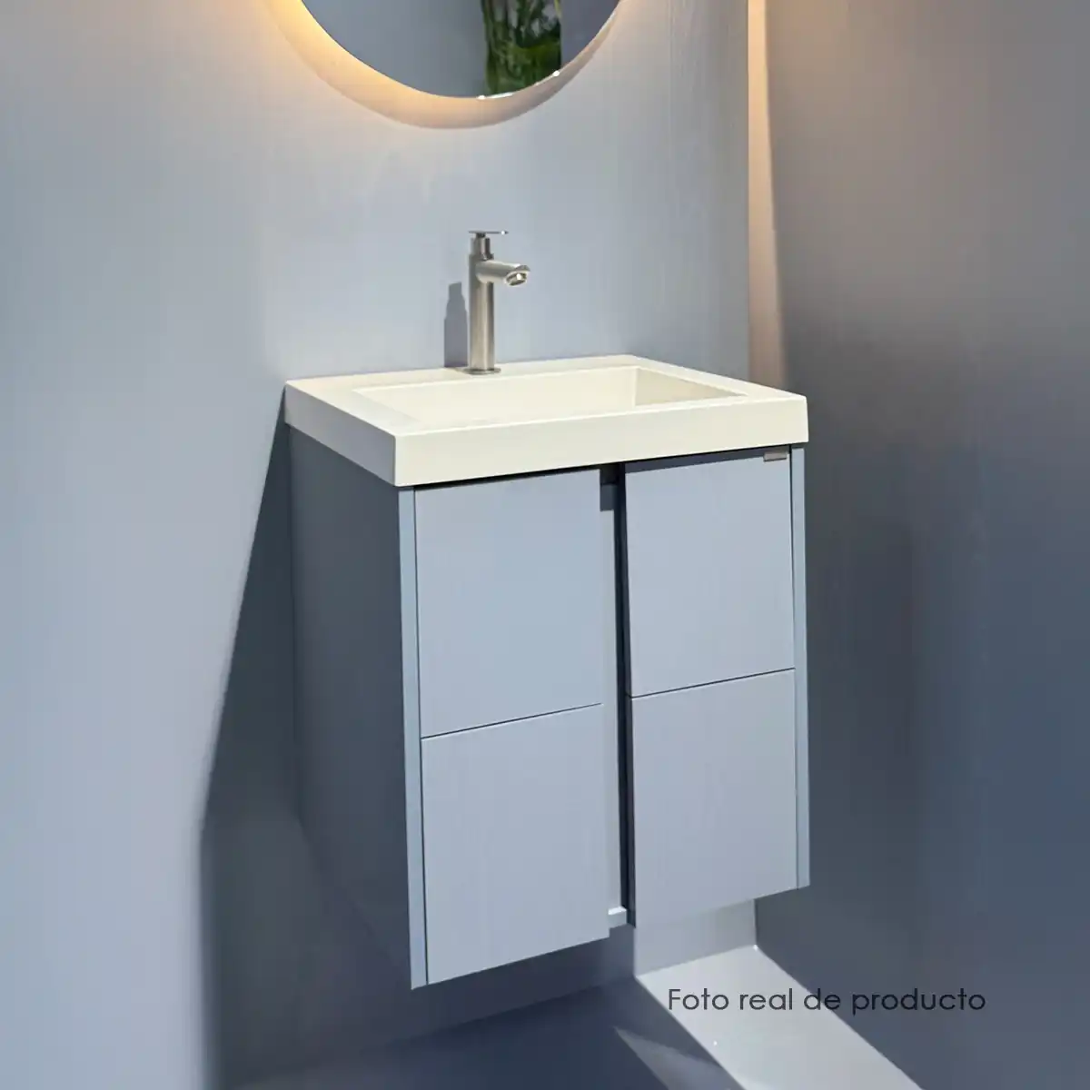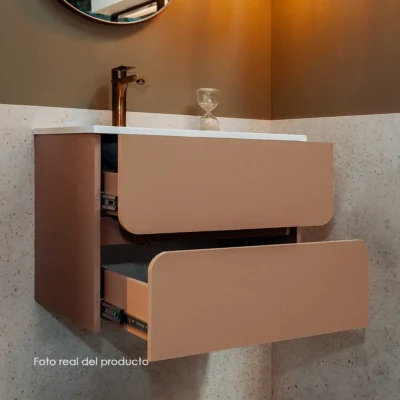 Lavamanos Siena de 48×43 cm, tipo vanity con diseño de líneas curvas, en complemento con el nuevo mueble Calder elevado, diseño de puertas embebidas que se integran a la perfección con el mueble sin bordes sobresalientes. Cuenta con 4 puertas con bisagras cierre suave, canto rígido en frentes y espacio para almacenar los elementos de uso diario. Ideal para espacios reducidos, éste mantendrá la estética y el orden que su hogar se merece.