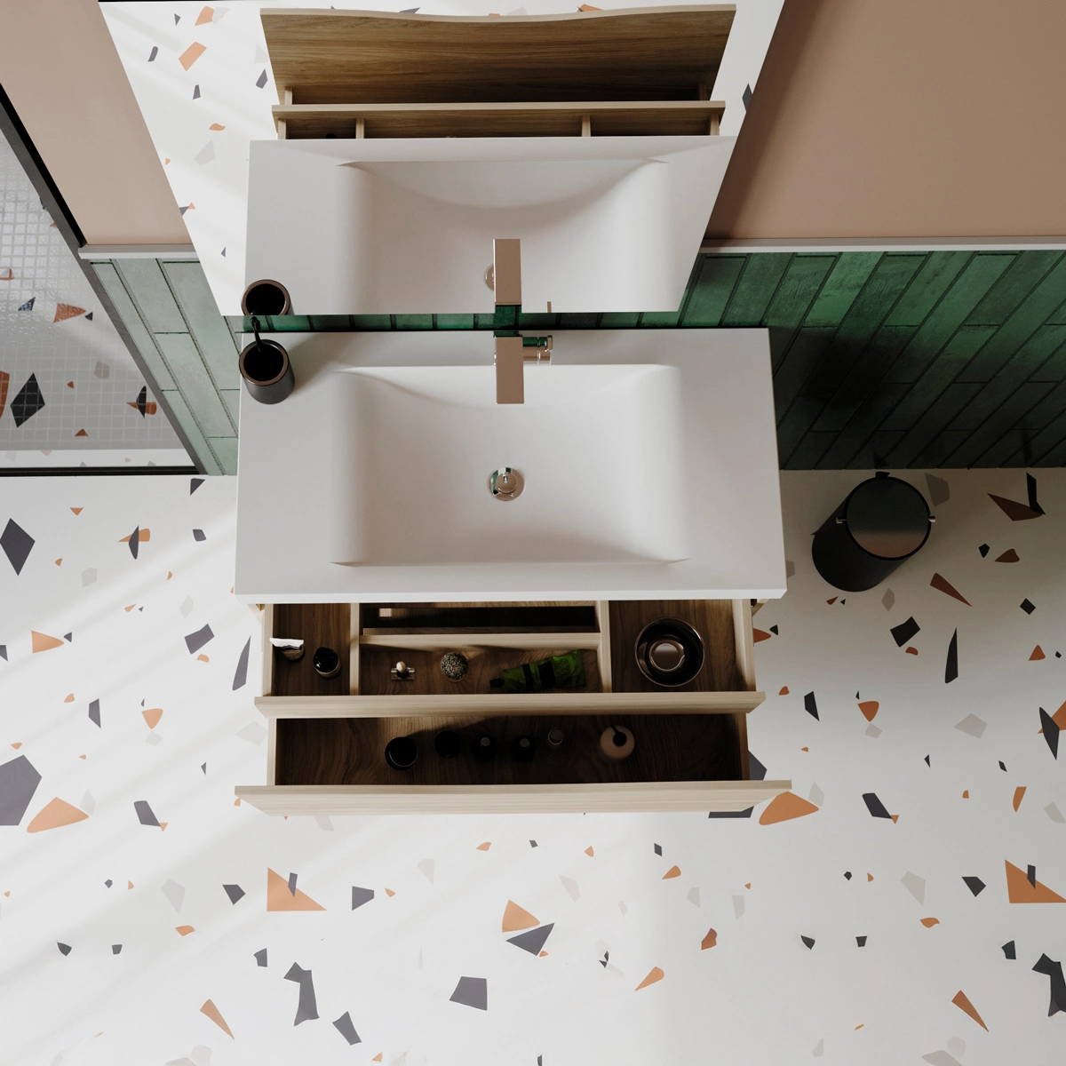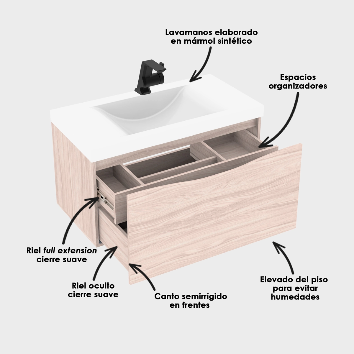 ¿Tienes pensado reformar tu baño? el lavamanos Siena de diseño minimalista en combinación con el mueble Greco de amplio almacenamiento, aportará un toque moderno con su cajón frontal sin manijas y diseño con frente curvo, acompañado de su cajón interno con divisiones que permiten mantener despejado y organizado el ambiente en tu baño.