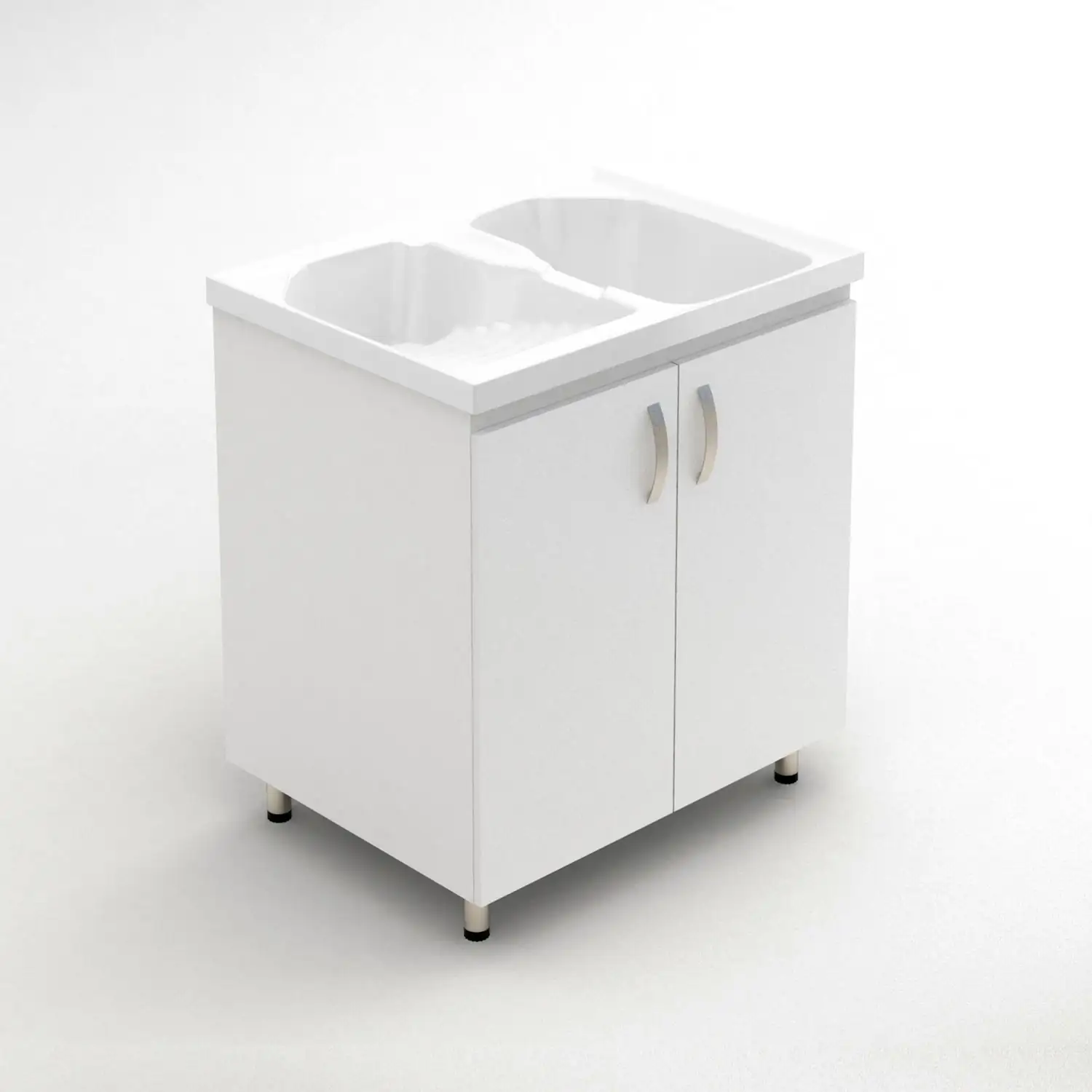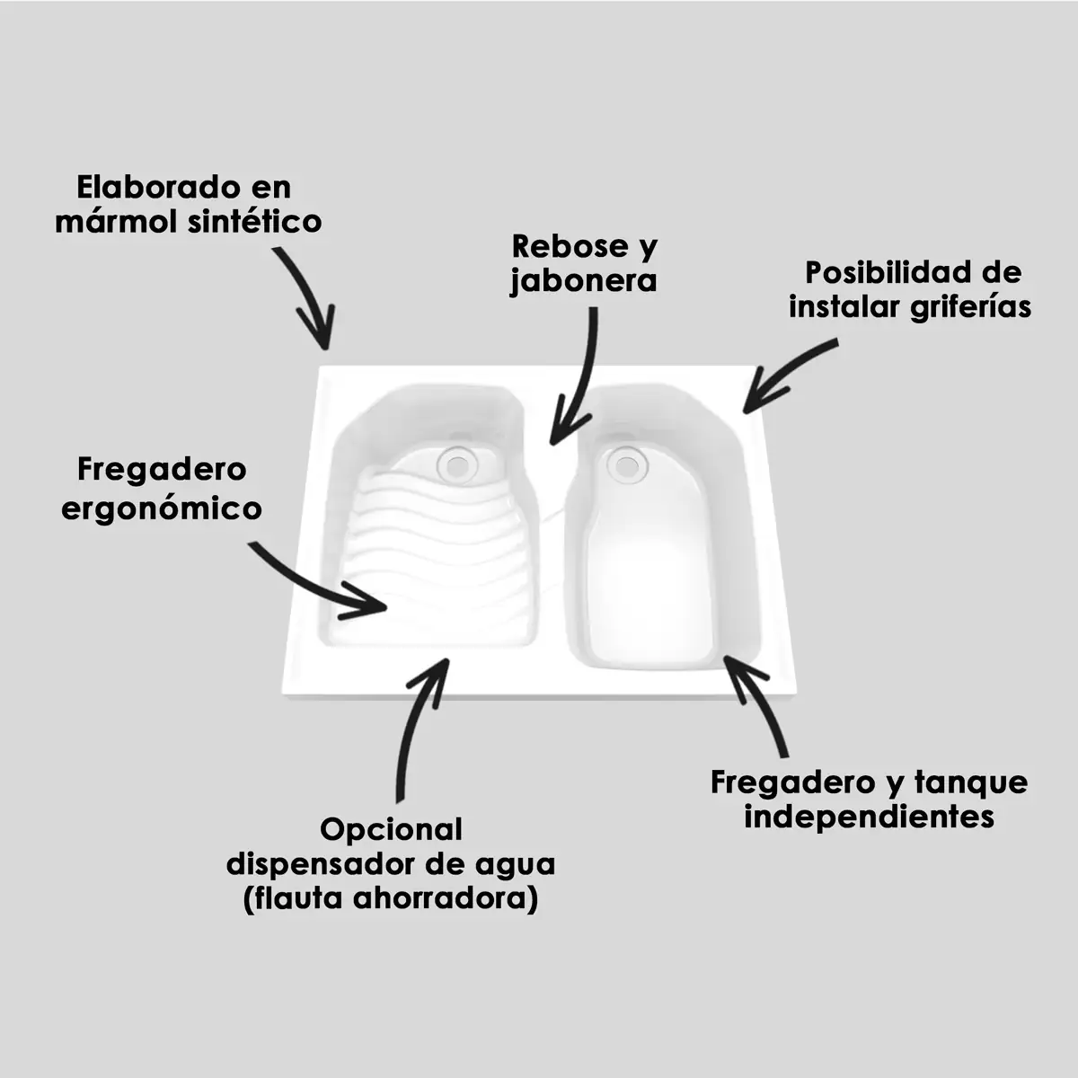 Lavadero de 80×60 cm, diseño compacto, cuenta con fregadero y sistema dispensador de agua (flauta ahorradora), en complemento con mueble resistente a la humedad (RH), con amplio espacio de almacenamiento, ideal para optimizar espacios en tu zona de labores. Nota: No incluye desagüe.