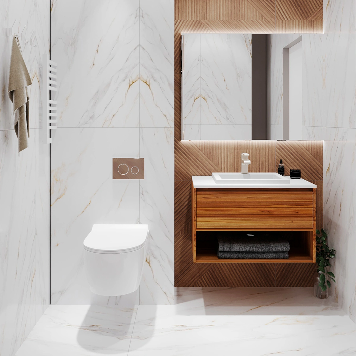 El NUEVO mesón más salpicadero elaborado en Quarzstone de 79x48cm con el lavamanos Oslo de 48×43 tipo vanity elaborado en mármol sintético, son el complemento perfecto para el diseño moderno del mueble Thalos de la línea Class, este cuenta con amplio espacio de almacenamiento y juntos mantendrán la estética y el orden que su hogar se merece.