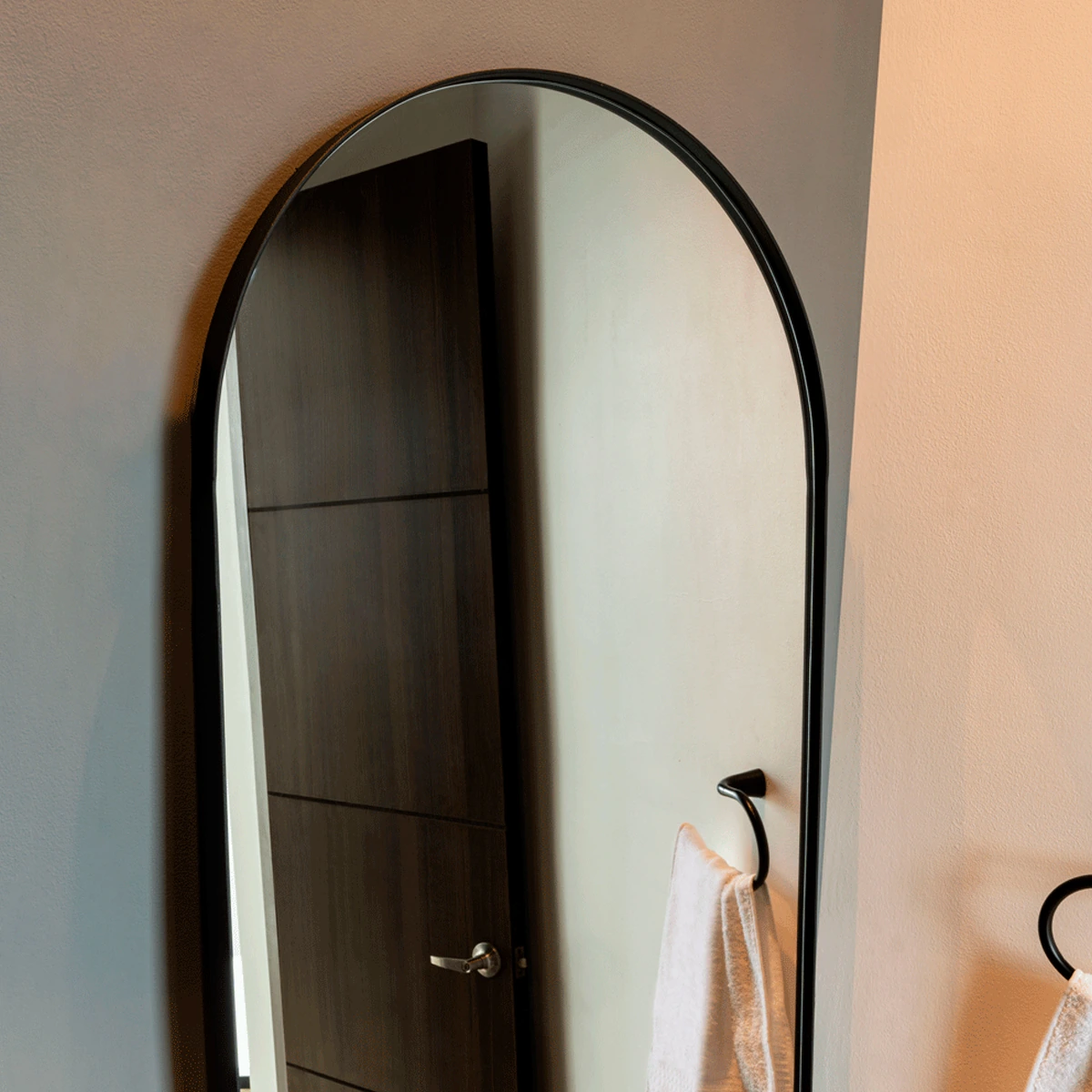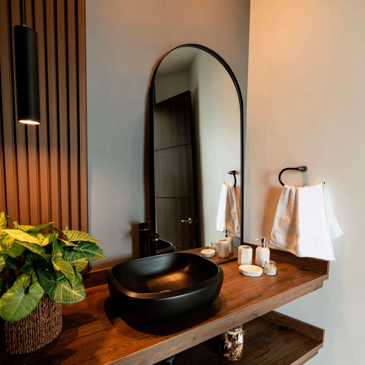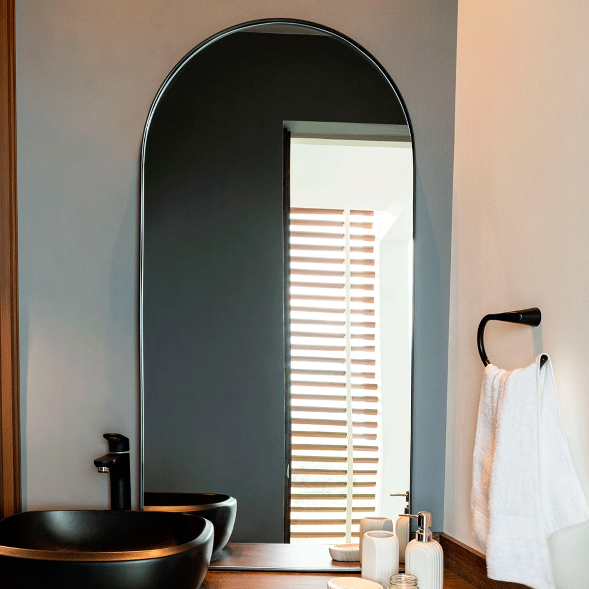 NUEVO Espejo Marsella con diseño rectangular y su extremo superior curvo con su estructura metálica. Incluye herrajes de alta calidad para una instalación fácil y segura, además de un ensamble a pared con chaflán, que asegura una colocación precisa y estable. Combínalo con los diferentes diseños de lavamanos y muebles Firplak.