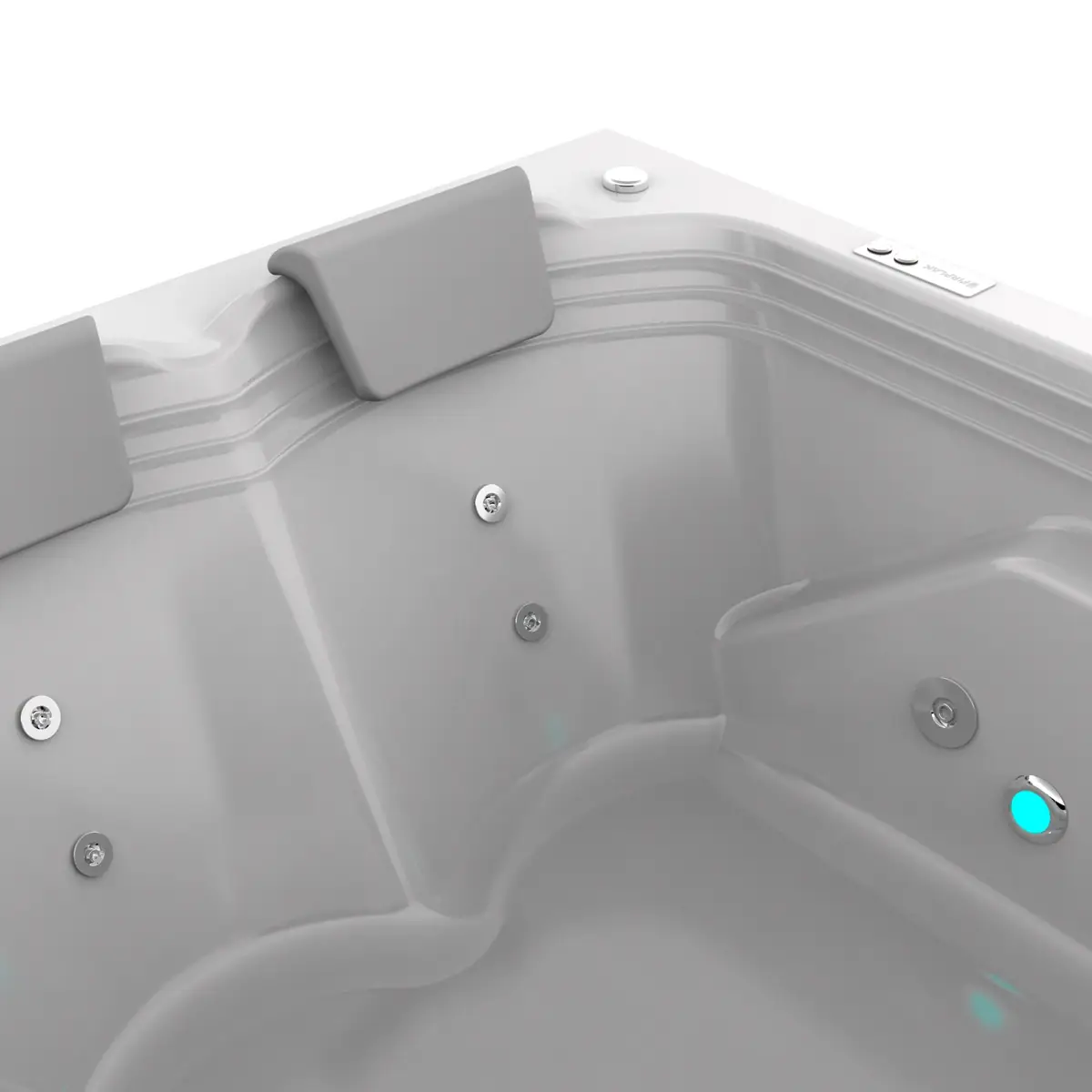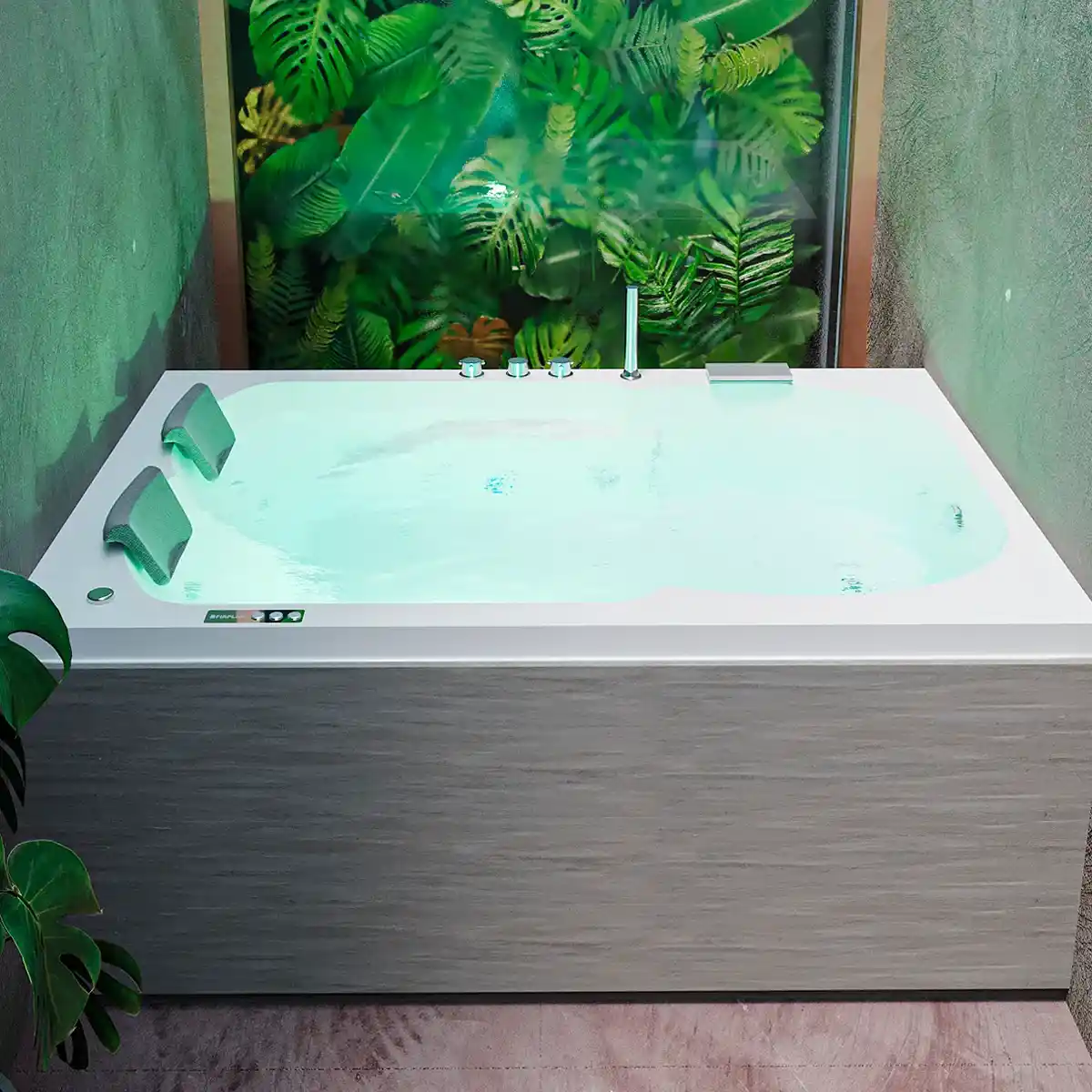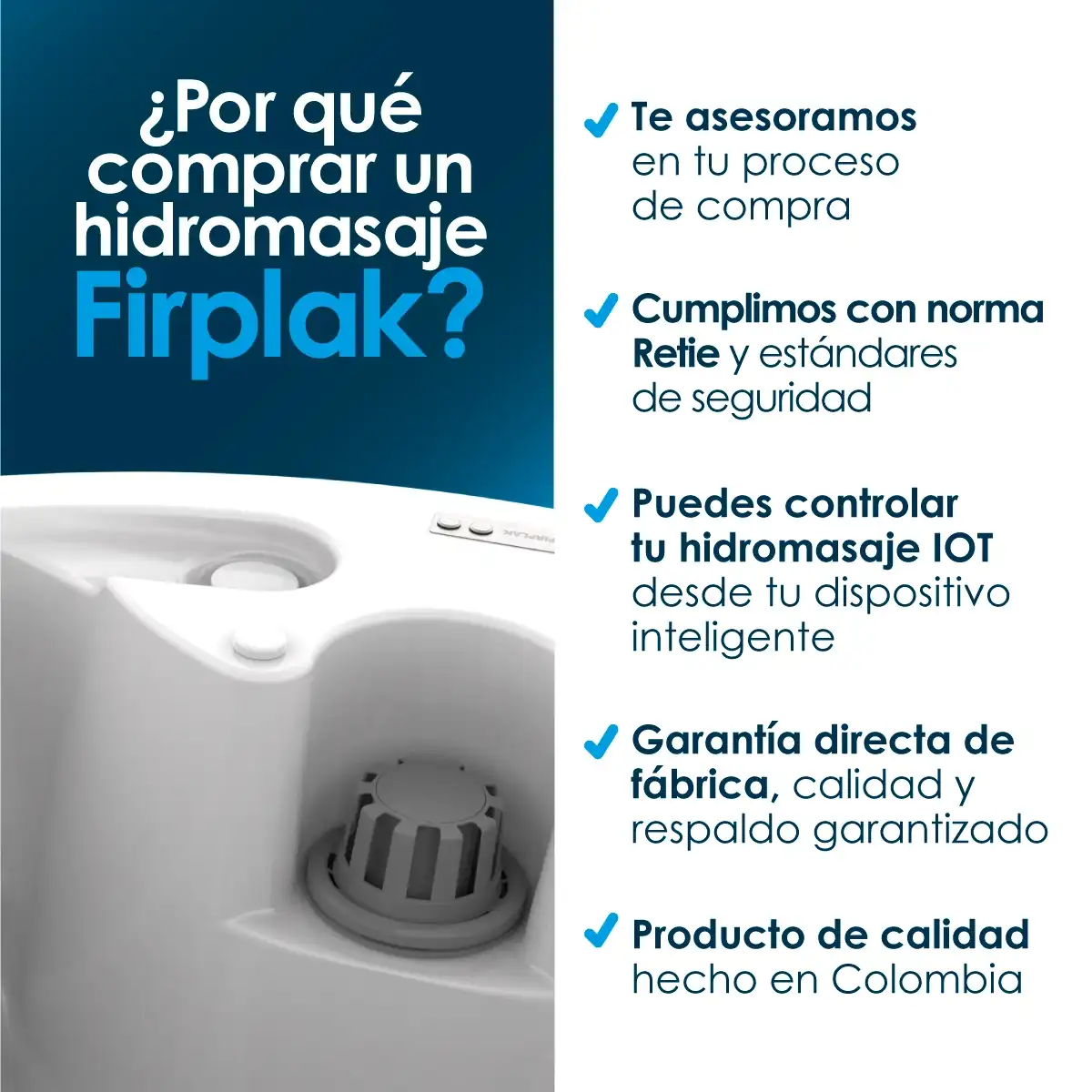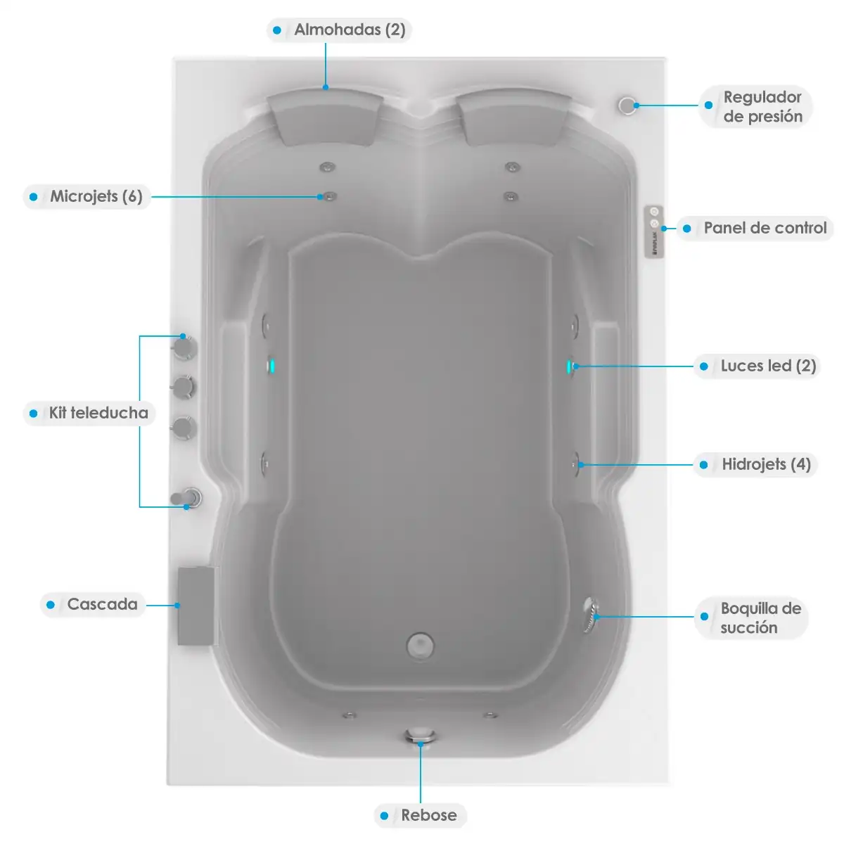 Jacuzzi de empotrar ideal para dos personas, diseño ergonómico con 10 potentes jets para realizar masajes en las principales zonas musculares del cuerpo. Vive la mejor experiencia de relajación y descanso con tu Spa en casa. Su diseño permite una fácil instalación sobre mampostería, piedra o madera.