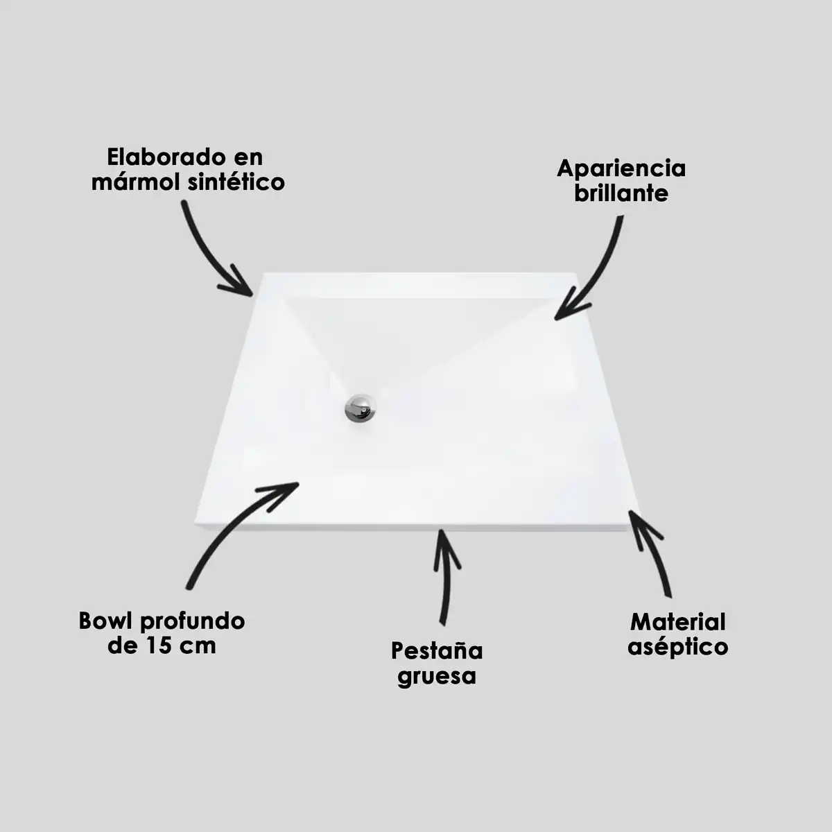 Lavamanos vanguardista de 63×48 cm tipo vanity, es de apariencia brillante y su diseño aporta un toque moderno al espacio en donde será ubicado.