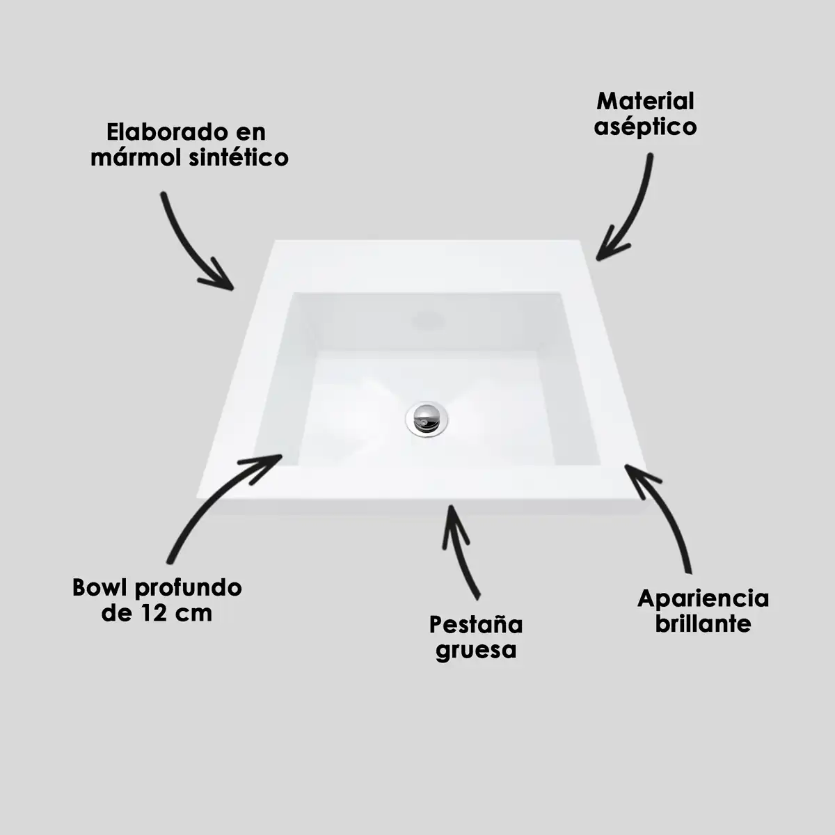 Lavamanos vanguardista de 48×43 cm tipo vanity, ideal para espacios pequeños, es de apariencia brillante y su diseño aporta un toque moderno al espacio en donde será ubicado.