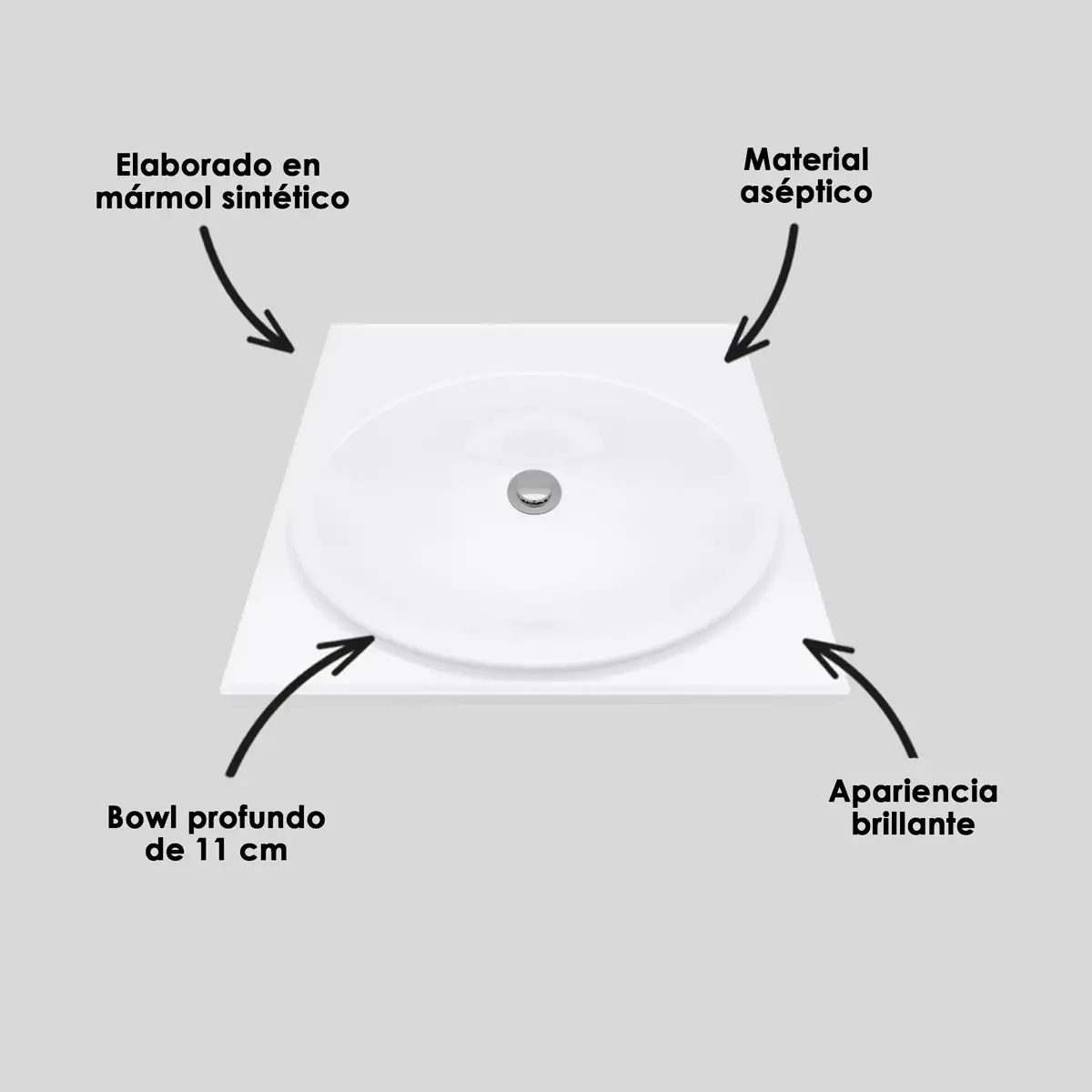 Lavamanos vanguardista de 48×43 cm tipo vanity, ideal para espacios pequeños, es de apariencia brillante y su diseño aporta un toque moderno al espacio en donde será ubicado.