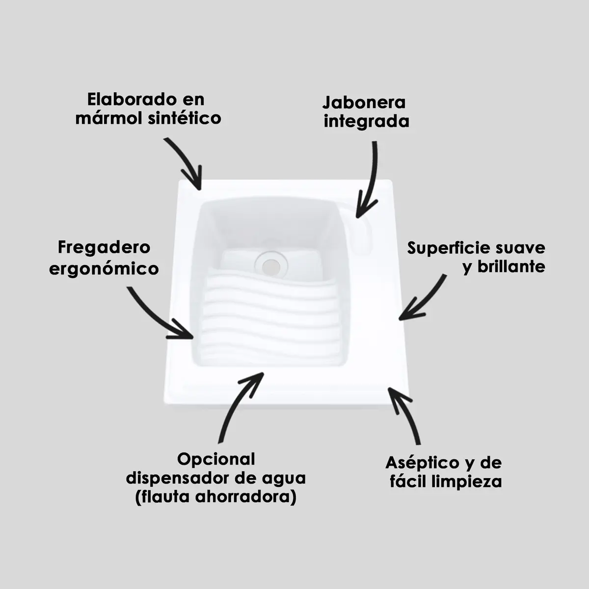 Con un diseño compacto el Lavadero Aqua de Firplak es perfecto para espacios pequeños, además cuenta fregadero ergonómico, su apariencia moderna integra un dispensador de agua (flauta ahorradora) que optimiza el lavado de tus prendas.