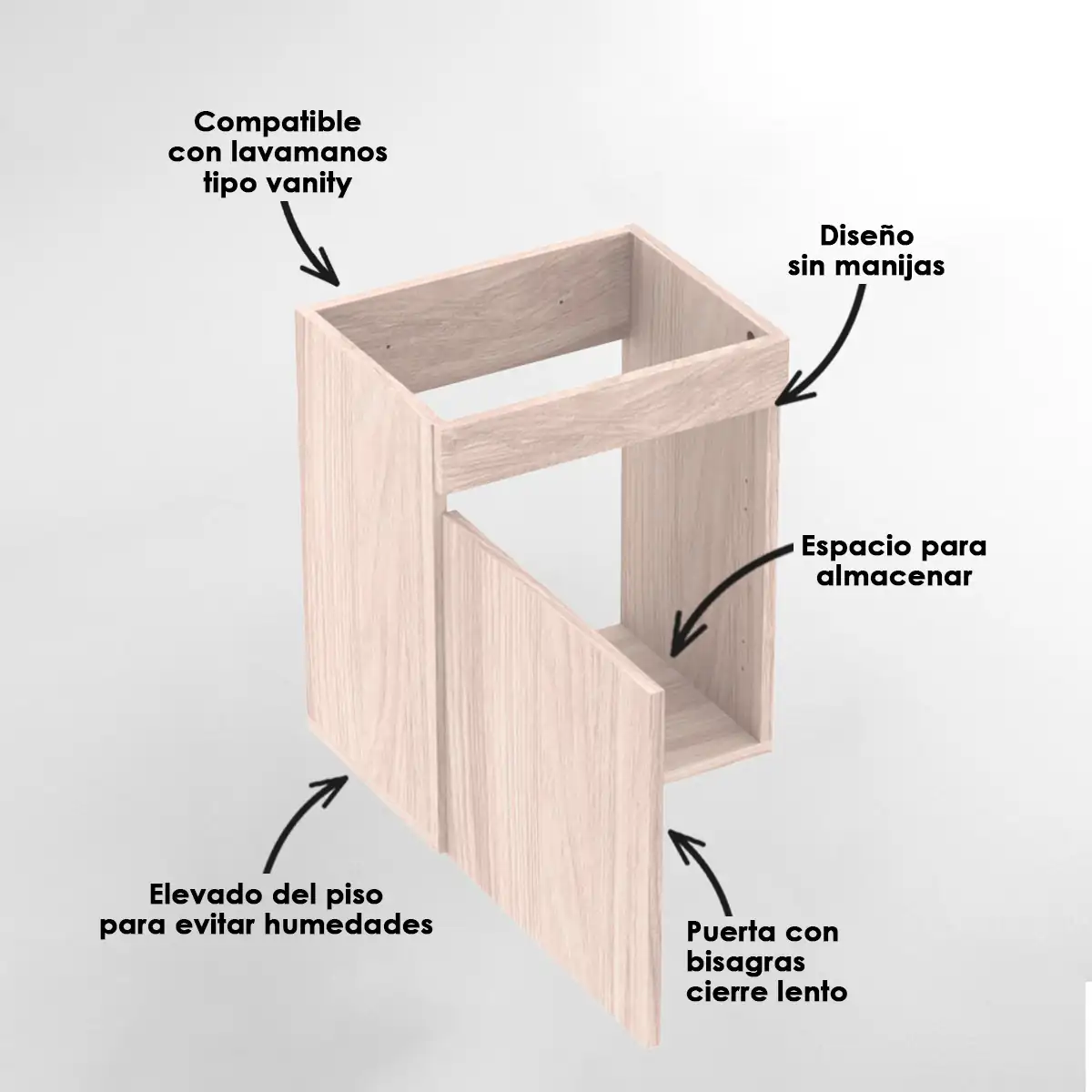 Mueble sin manija de empotrar a pared, con diseño básico y estético, compatible con lavamanos tipo vanity, contiene un espacio para almacenamiento, es elevado del piso para evitar humedades y es fácil de instalar. Ideal para espacios pequeños.