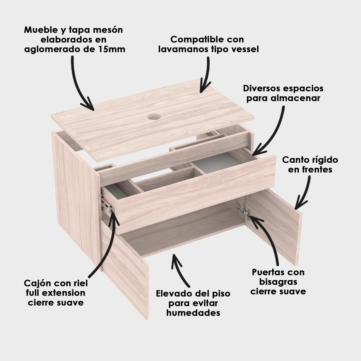 Combinación moderna con la nueva tapa mesón para lavamanos tipo vessel, fabricada en aglomerado de 15 mm y con cantos rígidos en sus cuatro lados. El mueble Macao Class con diseño estético y equilibrado de 1 cajón y 2 puertas que ofrecen un amplio espacio de almacenamiento. Este conjunto creará un ambiente moderno y acogedor para tu baño. No incluye lavamanos ni grifería.